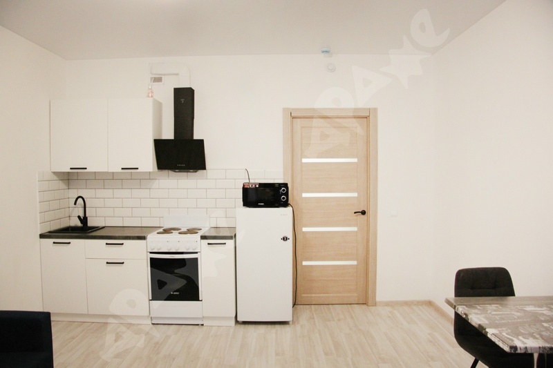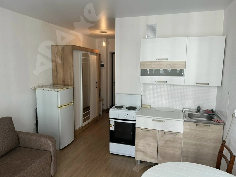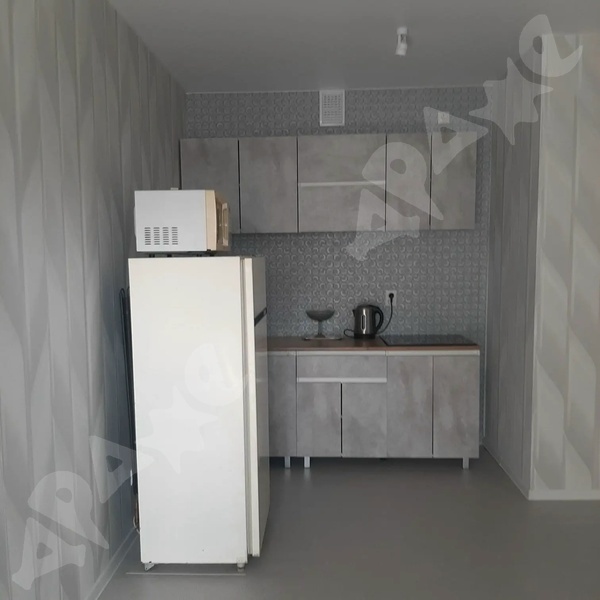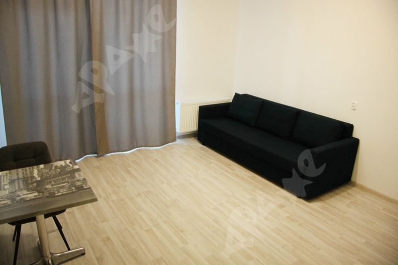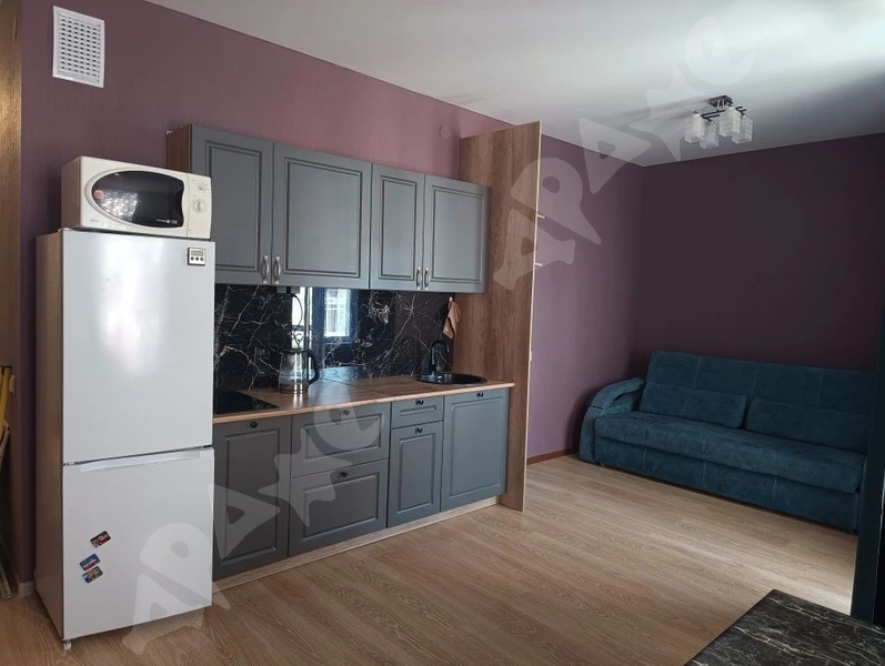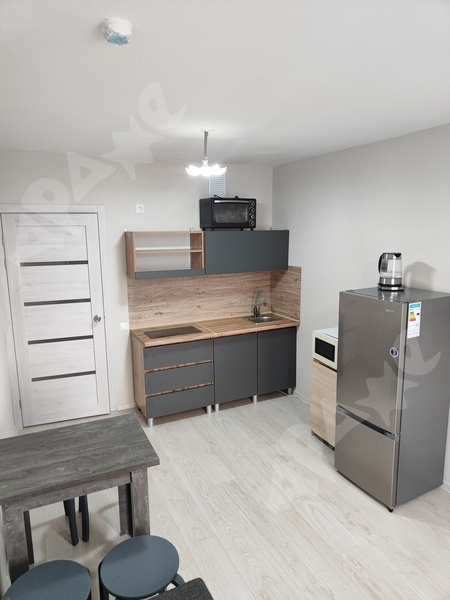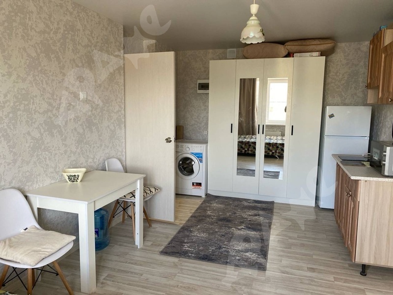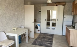 В студии есть все необходимое для комфортного проживания: кухонный гарнитур с варочной поверхностью, холодильник, стиральная машина, диван, стол и стулья.