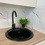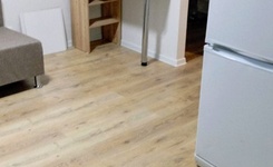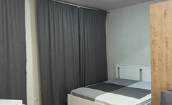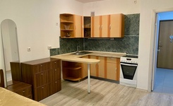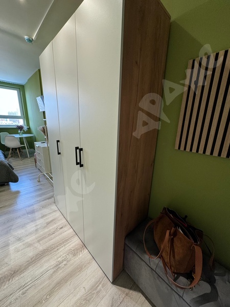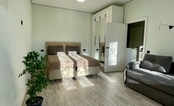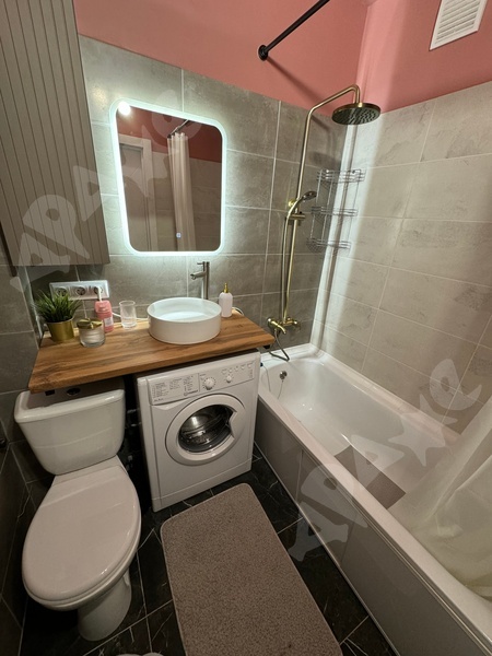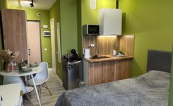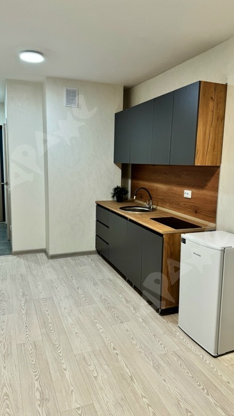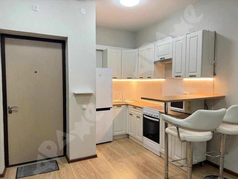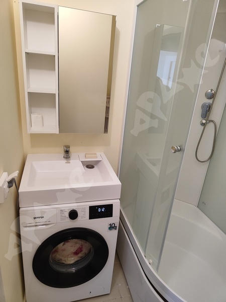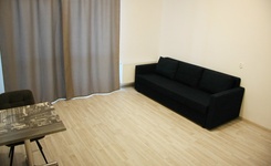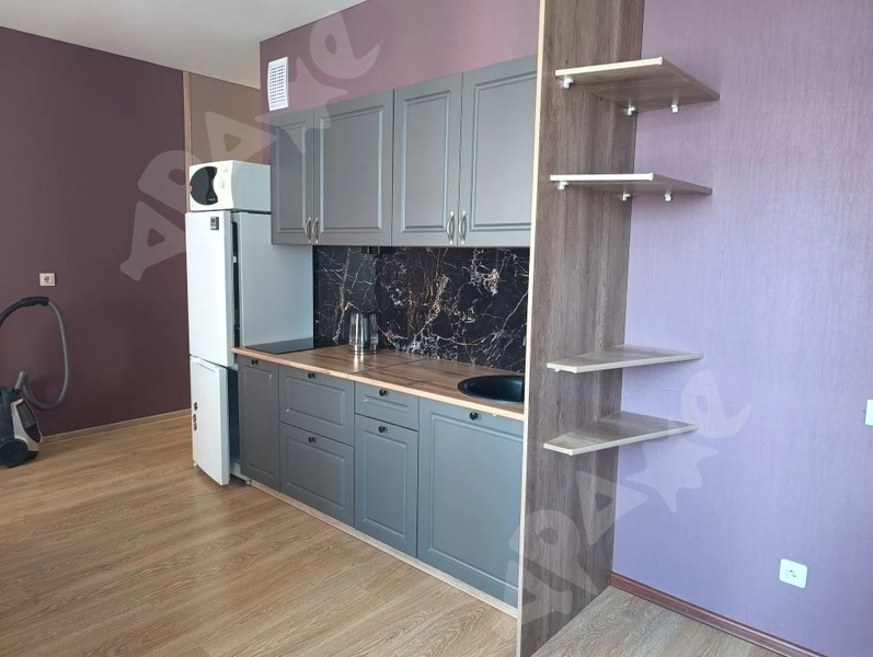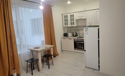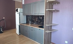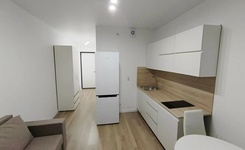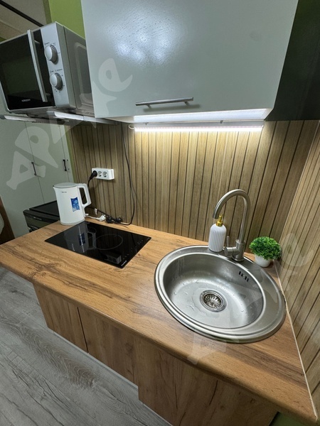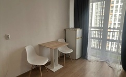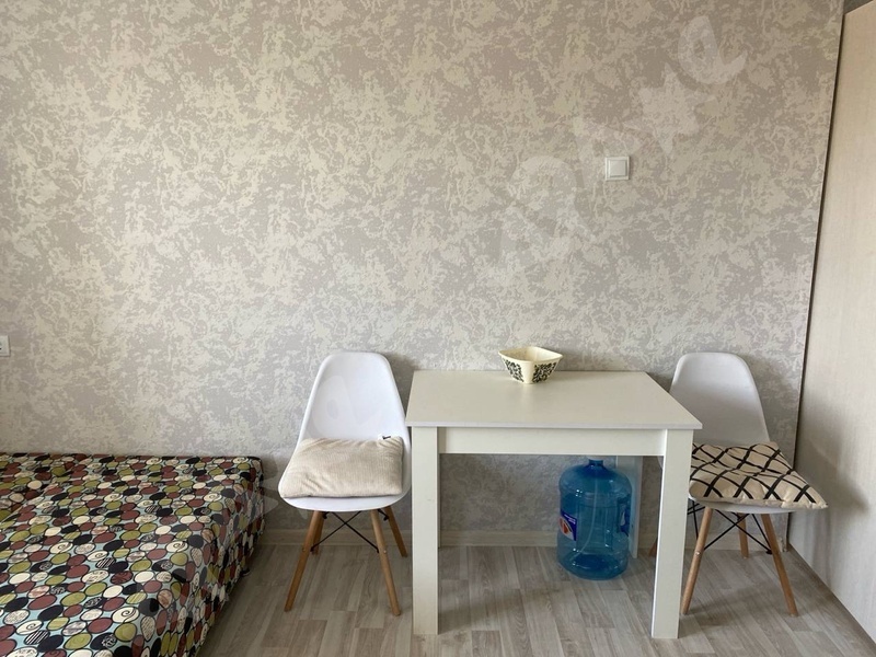 В студии есть все необходимое для комфортного проживания: кухонный гарнитур с варочной поверхностью, холодильник, стиральная машина, диван, стол и стулья.