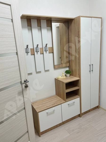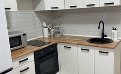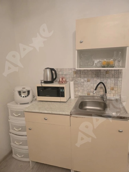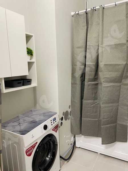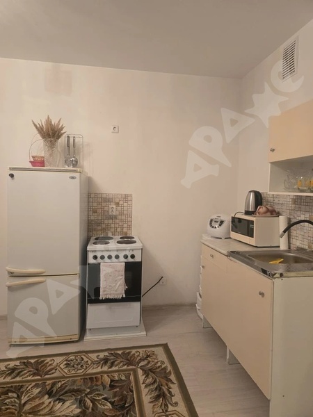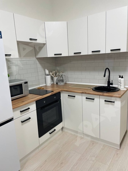 Вся необходимая мебель и техника для жизни: диван, шкафы, стиральная машина, холодильник, индукционная плита, микроволновка, а также полностью оборудованная кухня.