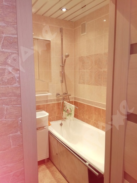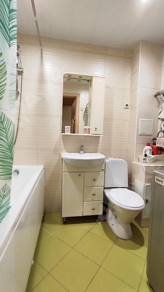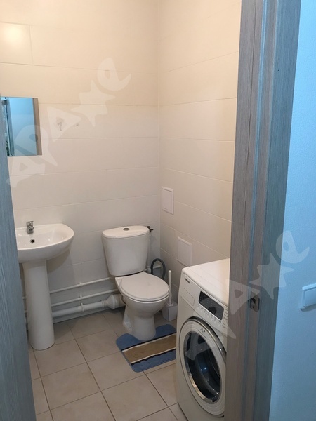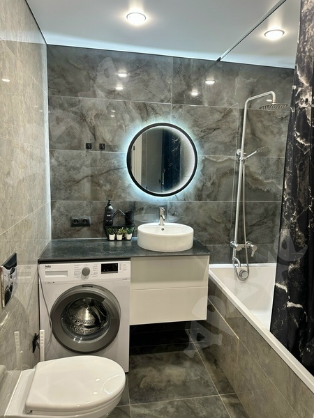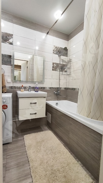 Ванная : стиральная машина , теплые полы , 2 скрытых шкафа для хранения, датчик протечки воды.