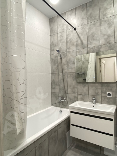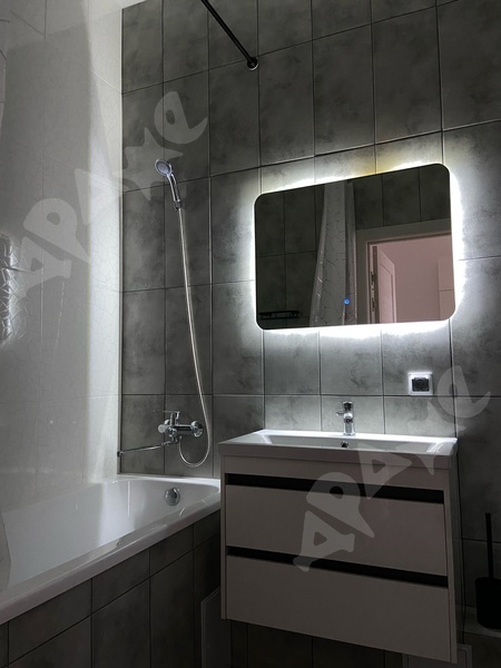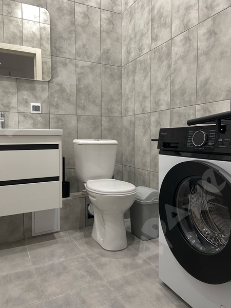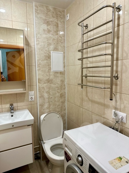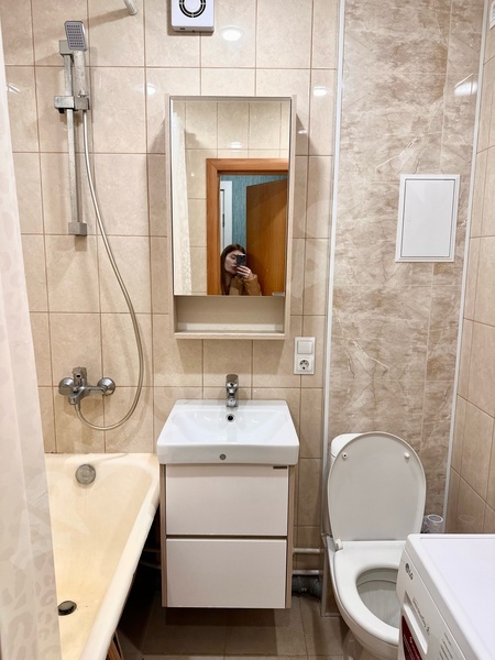 В сан. узле теплый пол, новая сантехника, стиральная машина, большая тумба под раковиной и шкаф над инсталляцией для удобства хранения вещей.