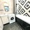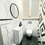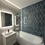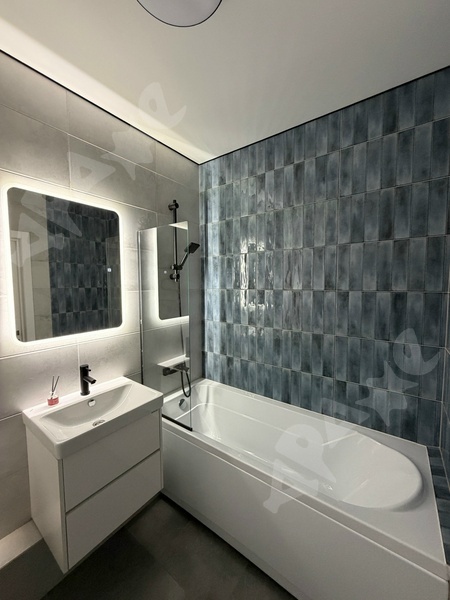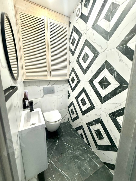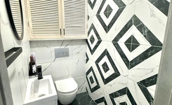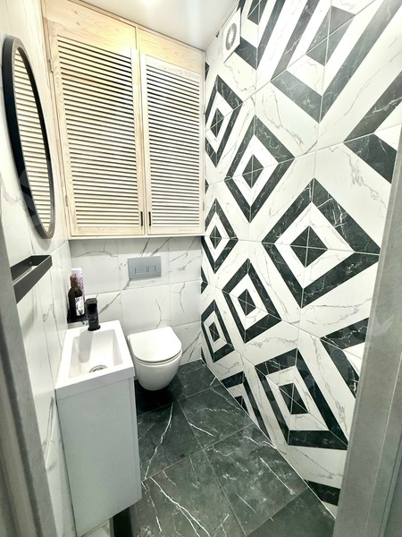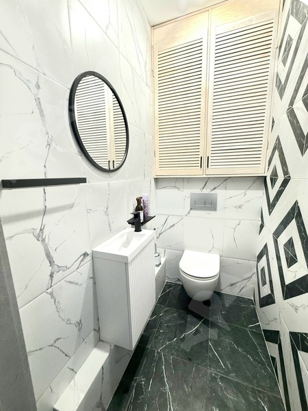 На стенах крупноформатный керамогранит "под мрамор" и другие дизайнерские решения.