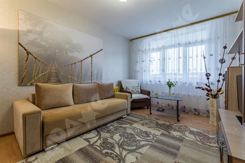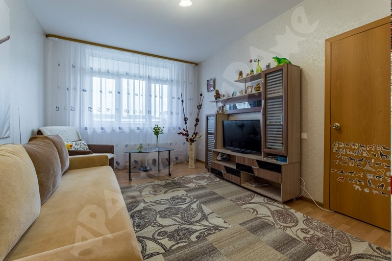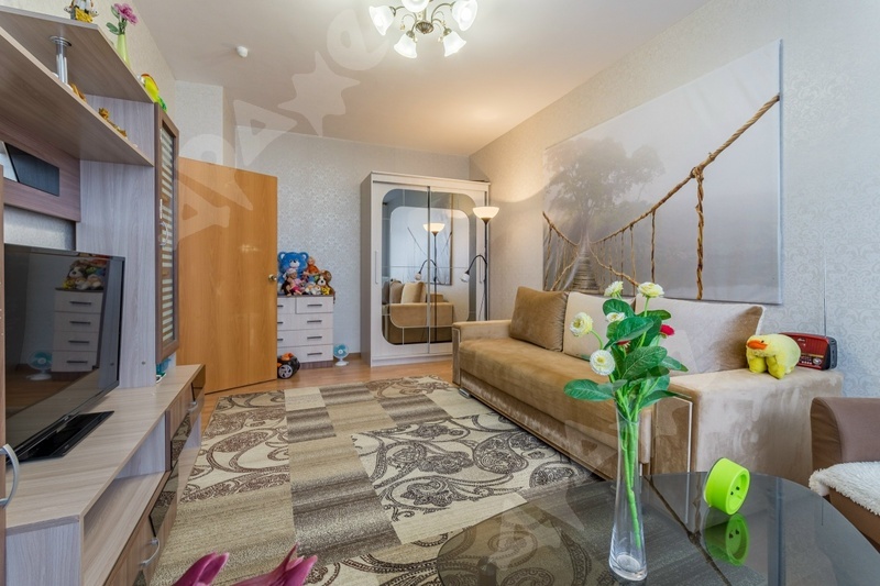 Комната: шторы+тюль, диван, кровать с матрасом (размер: 180*200, кровать стоит в нише), телевизор, комод, столик+стульчик для ребенка.