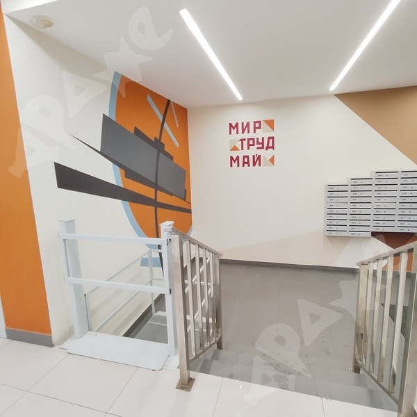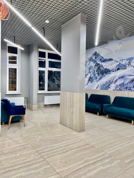 Стильный холл и зона ожидания с диванчиками в подъезде.