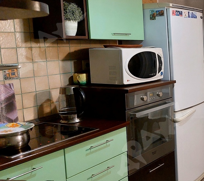 Из мебели: шкаф, холодильник, кровать, микроволновая печь, кухонный гарнитур, стол.