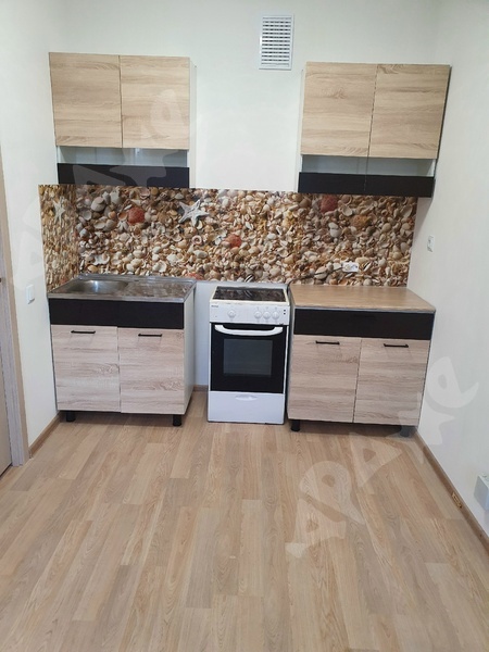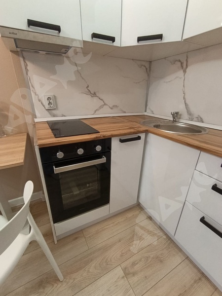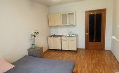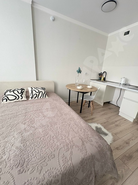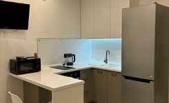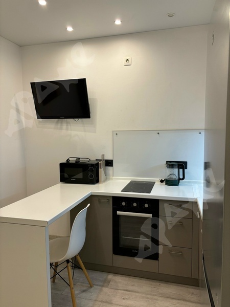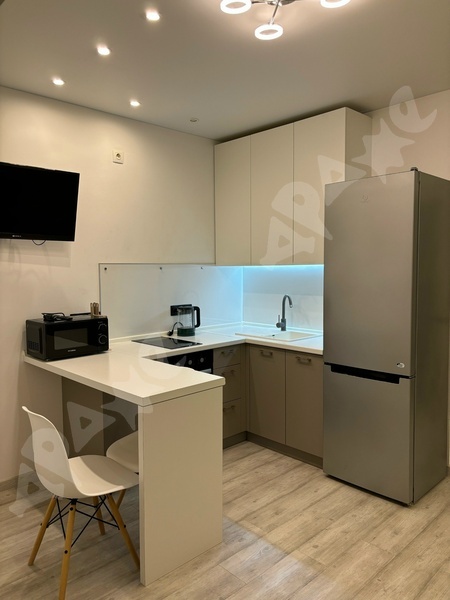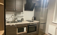 Полностью мебелированная современная кухня с холодильником, микроволновкой, индукционной плитой и духовым шкафом. В спальной зоне двуспальная кровать с ортопедическим матрасом.