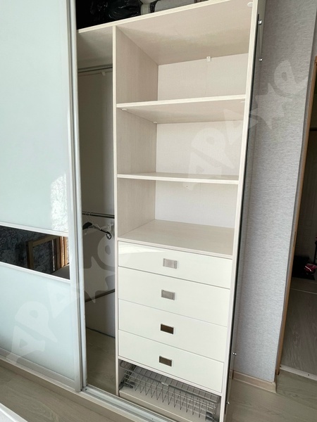Коридор: комод, вместительный трехстворчатый шкаф, настенная открытая вешалка, зеркало во весь рост, обувница с местом для сидения, ложка для обуви.