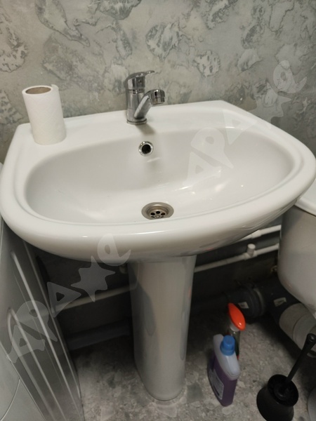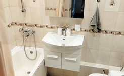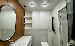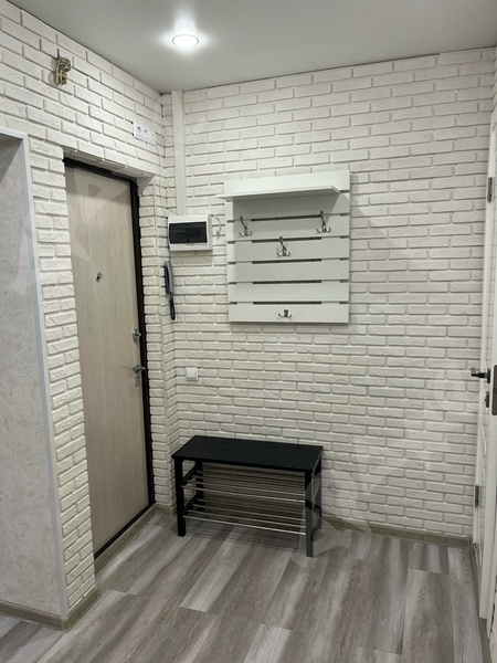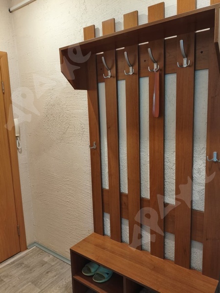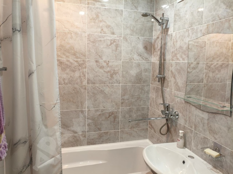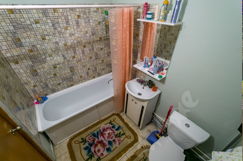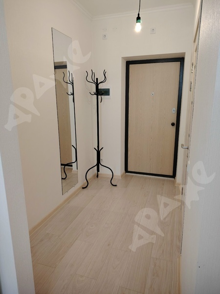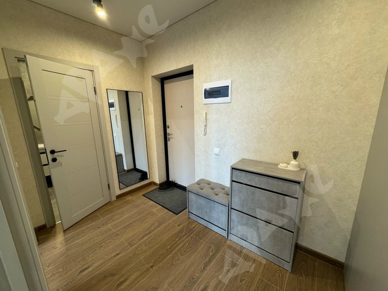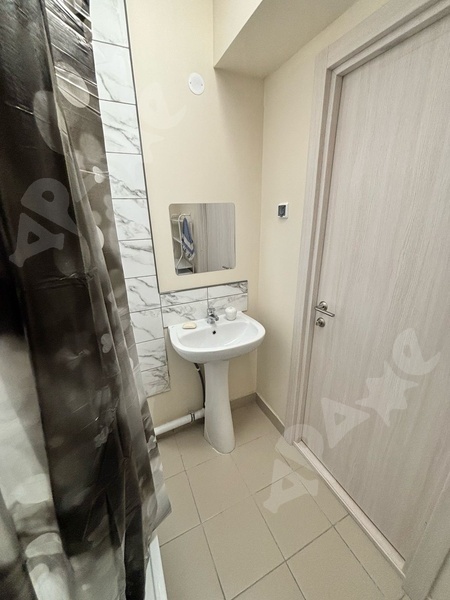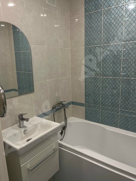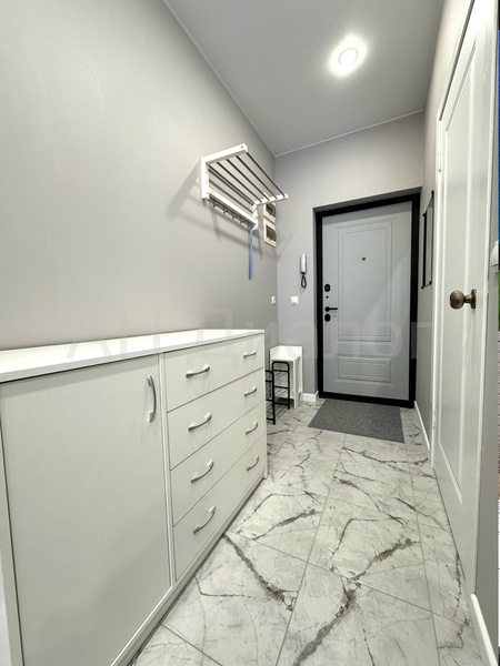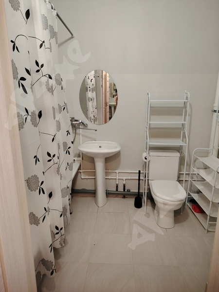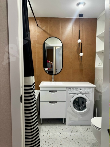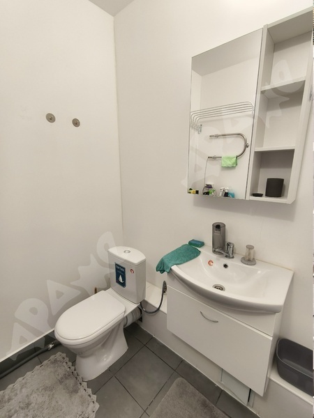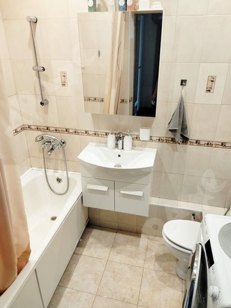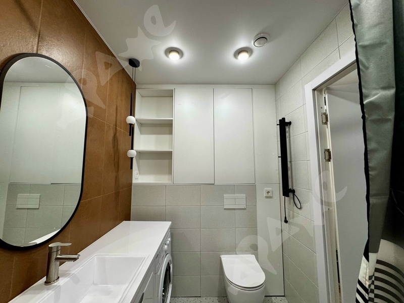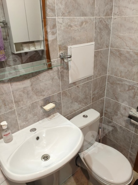 Ванная: теплый пол, вся сантехника (ванная, раковина, унитаз, гигиенический душ), шкаф под раковиной, стеллаж, электричский полотенцесушитель, электрическая вентиляция, зеркало. Коридор: большой шкаф, рейл, пуфик, зеркало.