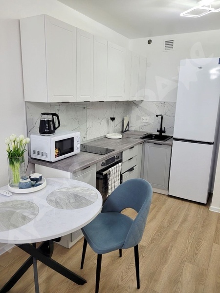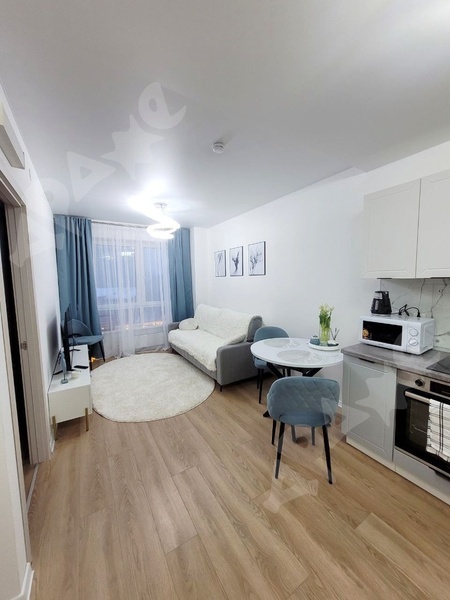 Квартира на 12 этаже. Сдается уютная, светлая, новая однокомнатная квартира площадью 33,2 кВ.м с новым ремонтом, этаж 12/18, есть балкон, отдельная гардеробная, дом очень теплый, ремонт новый, все как на фото. Окна выходят на детскую площадку и реку. Окна пластик, из мебели: диван, кровать, стол, стулья, все на фото. Из техники: стиральная машина, телевизор, холодильник, плита, микроволновая печь, сушилка для белья (все на фото). Территория благоустроена, 2 детские площадки, большая парковка.
