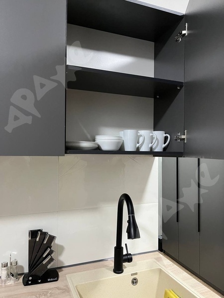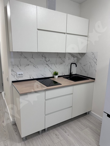 Кухня с отличным кухонным гарнитуром и современной встраиваемой бытовой техникой - варочная стеклокерамическая поверхность на 2 конфорки, микроволновка, холодильник, каменная мойка .