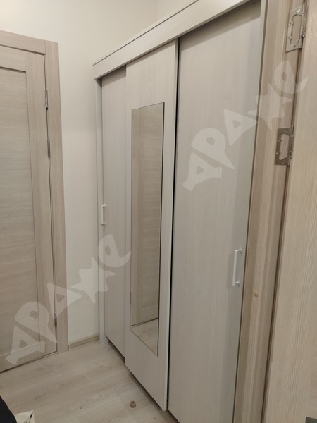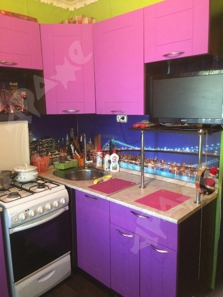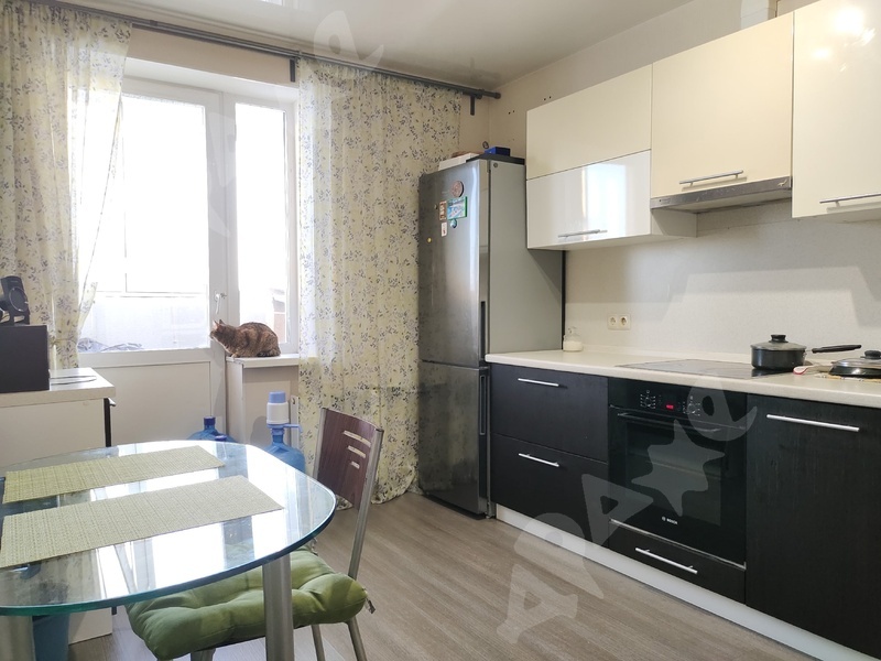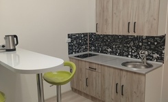 На просторной кухне располагается кухонный гарнитур, оборудованный эл. плитой, холодильником, микроволновкой, электрическим чайником и обеденным столом . имеется раскладной диван (еврокнижка) . Имеется вместительный шкаф купе.