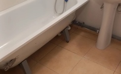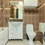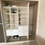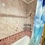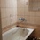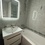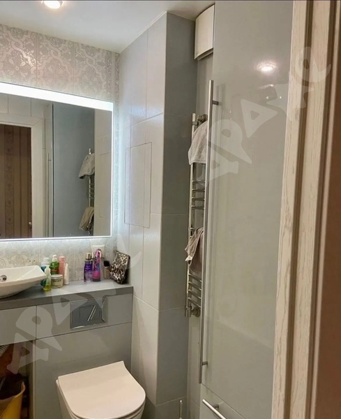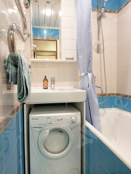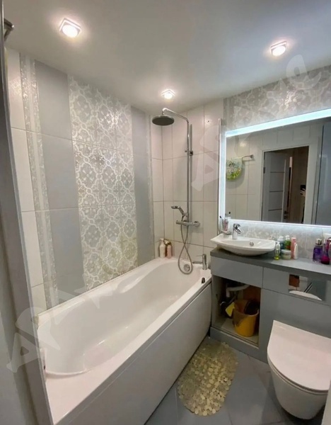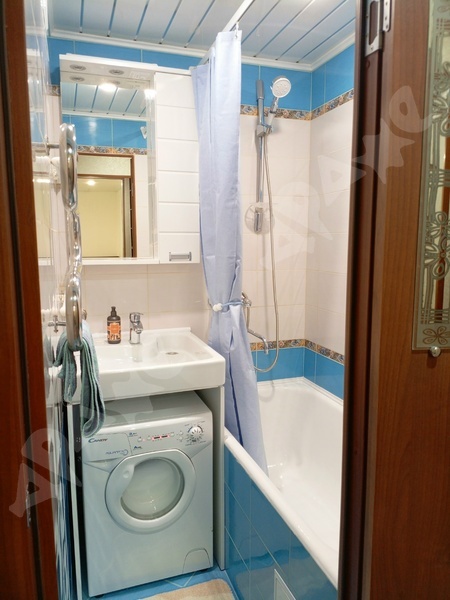 Ванная: кафель, акриловая ванна (170 см), раковина, тропический душ, электрический полотенцесушитель, настенный и напольный шкаф, стиральная машина, современное зеркало с подсветкой.