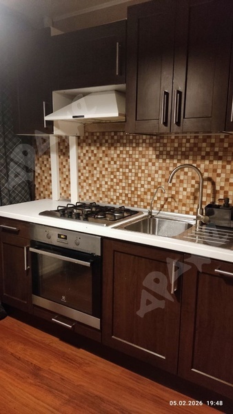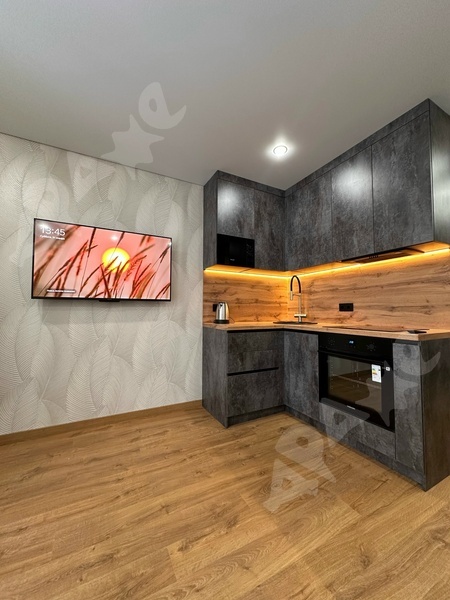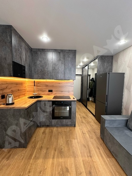 Площадь квартиры 19 кв.м, кухня 9 кв.м., есть балкон,сан.узел смежный, все как на фото. Окна пластик, из мебели все, что видите на фото. Есть плита, духовка,посудомоечная машина, чайник, диван, шкаф, телевизор СМАРТ.