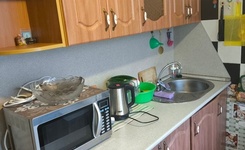 - кухонный гарнитур, плита, холодильник, микроволновая печь, чайник