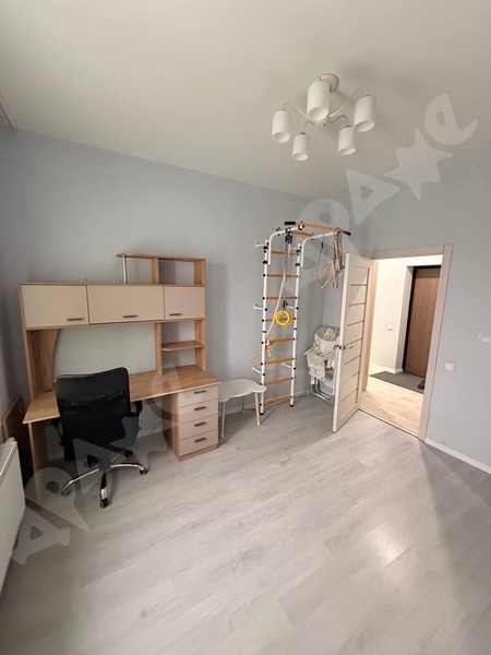 Полностью мебелизирована: двухспальная кровать, большой шкаф, комод, письменный стол, детская шведская стенка, диван, стол и стулья.