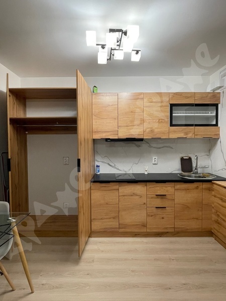 Кухня совмещённая с гостиной , есть диван ( также как дополнительное спальное место ).