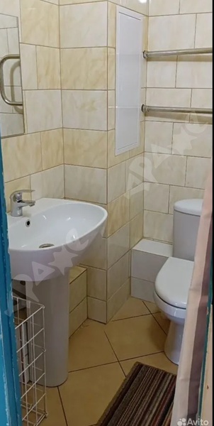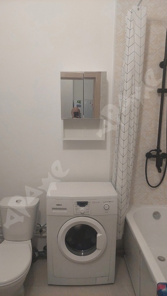 Санузел совмещенный, есть стиральная машина, шторка в ванной, коврики, зеркало с полочкой.