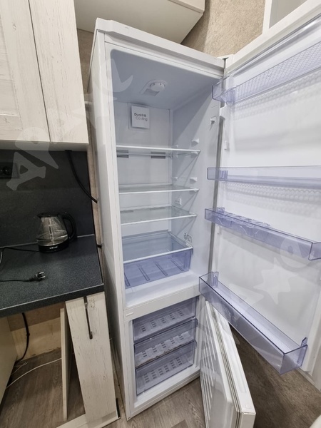 На кухне - холодильник, газовая плита, микроволновка, электро-чайник, гарнитур, посуда. Стиральная машина. Телевизор.