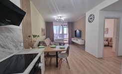 Вся нужная для жизни посуда,мебель и техника есть,в ванной теплый пол( техника-посудомойка, стиральная машина,микроволновка,пылесос, утюг,фен.)