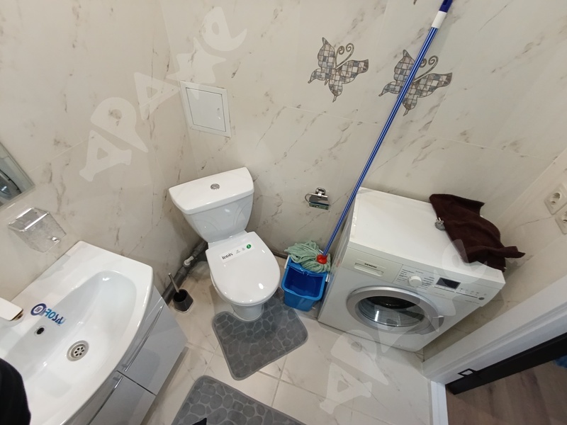13 этаж, есть диван, холодильник, стиральная машина, кухонный гарнитур с плитой, микроволновка, места для хранения одежды, телевизор, возможно установить дополнительное спальное место.