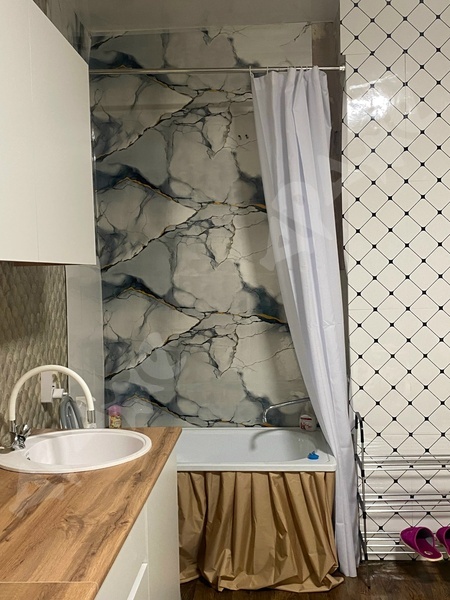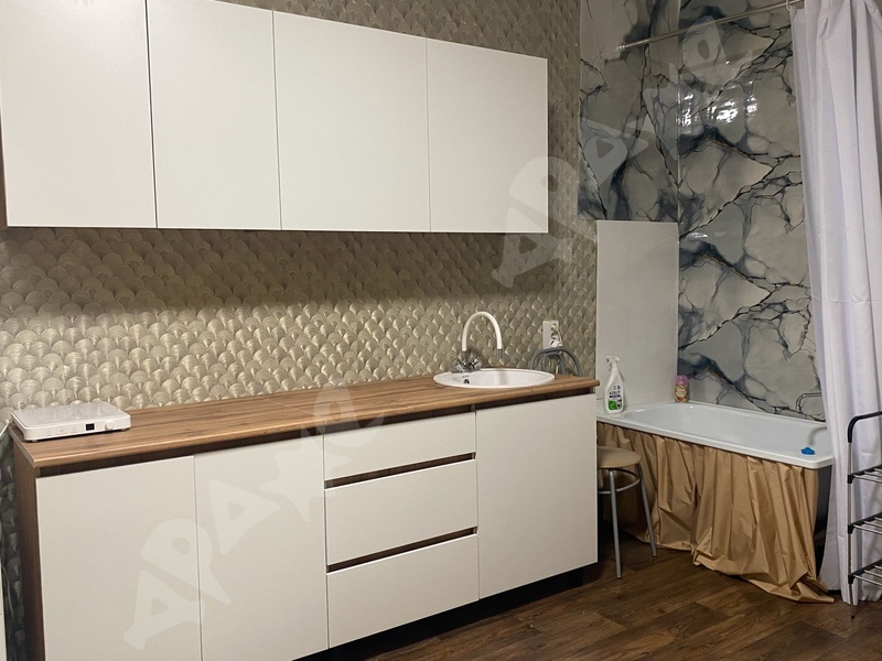 В комнате ванна, кухонная мойка. Горячая и холодная вода.
