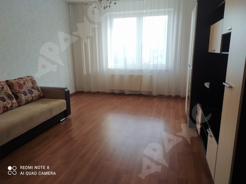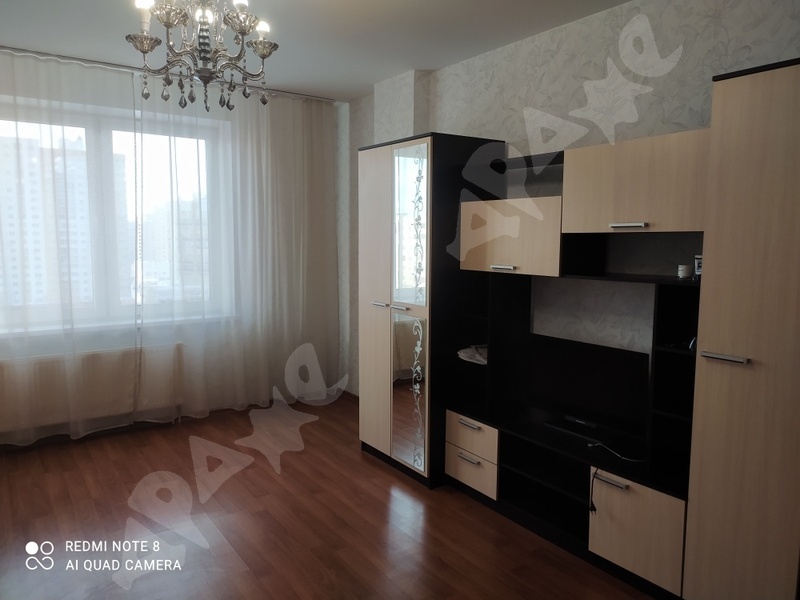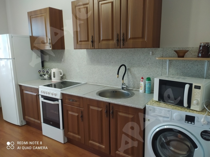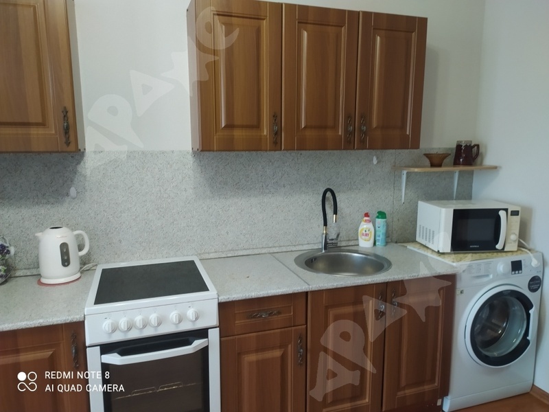 13 этаж, есть диван, холодильник, стиральная машина, кухонный гарнитур с плитой, микроволновка, места для хранения одежды, телевизор, возможно установить дополнительное спальное место.