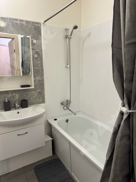Этаж 4, в 25-и этажном доме. В квартире есть сантехника, тумба с раковиной в зоне кухни, диван.