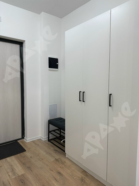 В квартире удобная двуспальная кровать, раскладной диван, кухонный гарнитур, стол и стулья, сушилка, гладильная доска, шкаф для одежды.