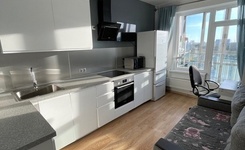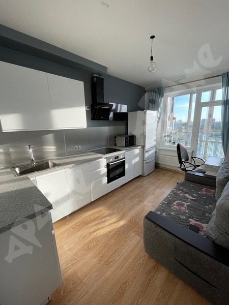 Новая квартира на 13-м этаже с лоджией, из мебели есть только кухня. Установлены регуляторы отопления, есть консьерж, закрытый тихий и большой двор. С парковкой сложно.