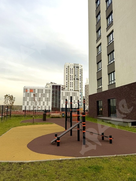 Современный жилой квартал Спутник-1 в оригинальной космической тематике: прогулочные аллеи с зелеными островками, игровые комплексы, воркаут-зоны выполнены в ярком "звездном" стиле.