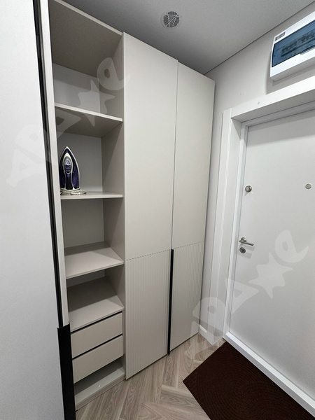 - Коридор с гардеробом до потолка, полками для продуктов, а так же прихожей со встроенной сидушкой ;