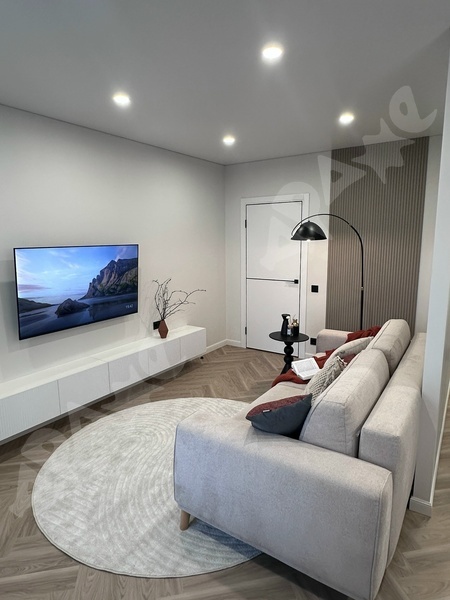 Из мебели: шкаф в коридоре, красивый диван на ножках в ткани букле, встроенная кухня, обеденная зона (стол со стульями), вместительная гардеробная, журнальный столик, подвесная тумба под ТВ.