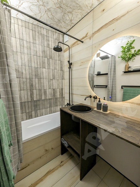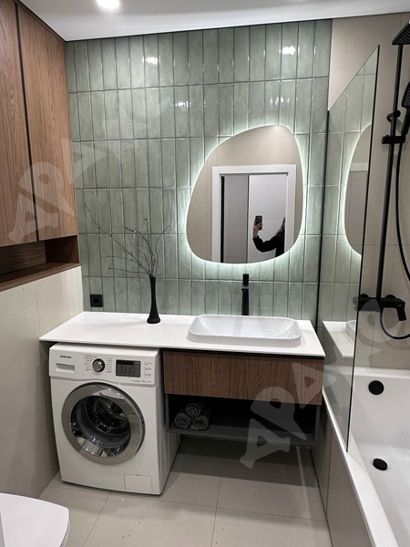 - Ванная комната с тёплыми полами, широкой, полногабаритной ванной, подвесной раковиной с полками, столешницей, а так же зеркалом с подсветкой и подогревом;