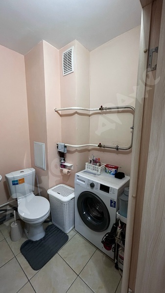 Санузел отличается большим пространством, оснащен всей необходимой сантехникой и стиральной машиной.
