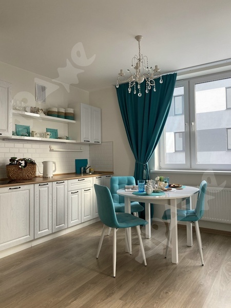 В распоряжении: светлая кухня-гостиная с обеденной зоной, просторная спальня с двумя окнами, гардеробная, коридор и ванная комната.