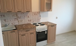 Квартира в новостройке на 11-м этаже, из мебели есть диван, обеденный стол, кухонный гарнитур, прихожая. Есть стиральная машина.