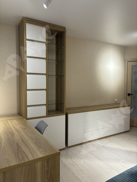 В комнате есть места хранения (шкаф и стенка), диван, стол и стул. Комната закрывается на ключ.