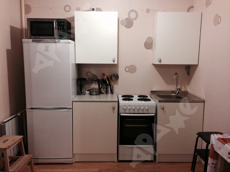 - кухонный гарнитур, плита, холодильник, микроволновая печь, чайник