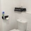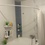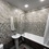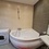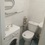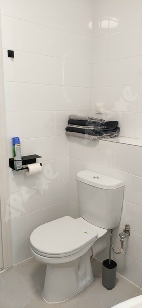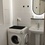 Санузел совмещенный: теплый пол, подвесной унитаз, ванная с душевой системой, стиральная машина, большой шкаф для хранения.