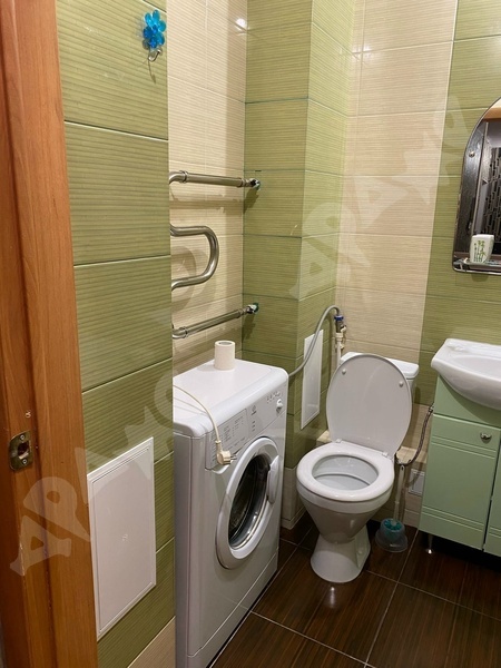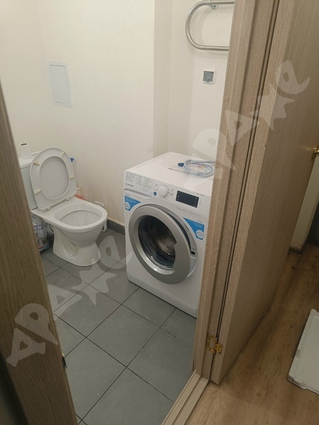 • Санузел совмещен с ванной комнатой, в которой имеются встроенные шкафы для хранения и стиральная машина.