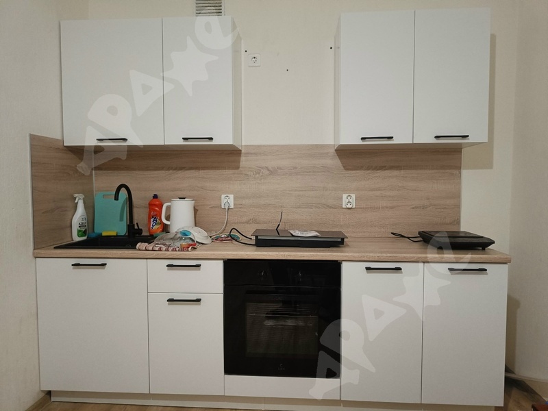 стол + стулья, диван, кухонный гарнитур акрил, встроенный духовой шкаф, варочная поверхность на 4 конфорки , двухкамерный холодильник и микроволновая печь, электрический чайник, посуда, столовые приборы.