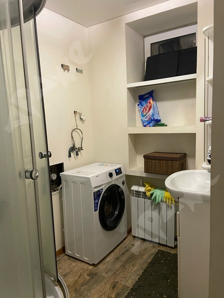 , стиральная машина, телевизор, диван). Есть необходимые бытовые мелочи, как посуда, гладильная доска, напольная сушилка).