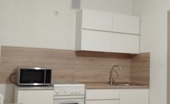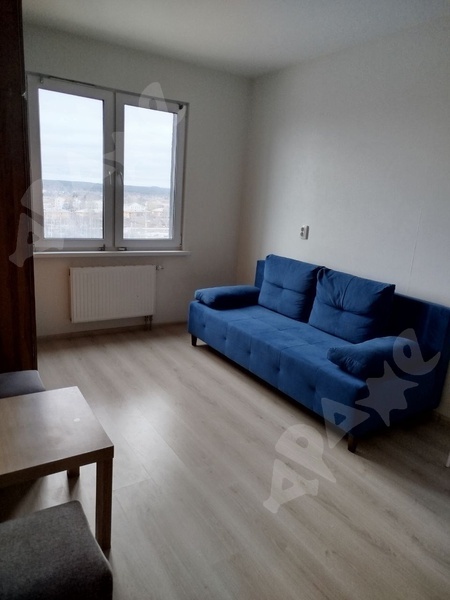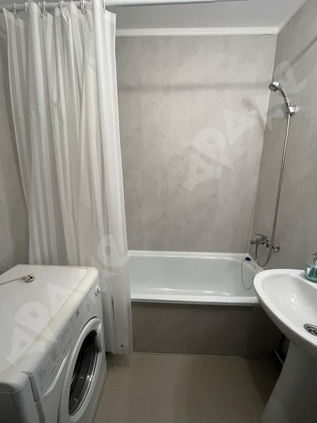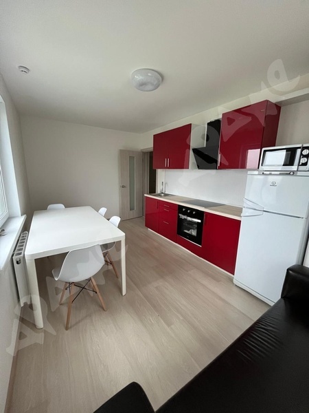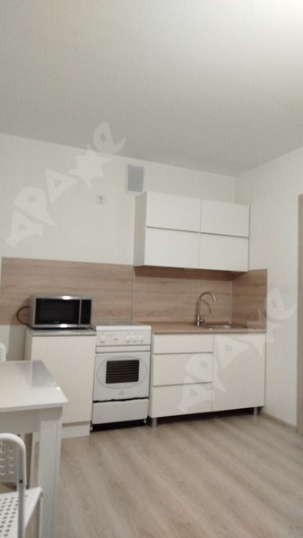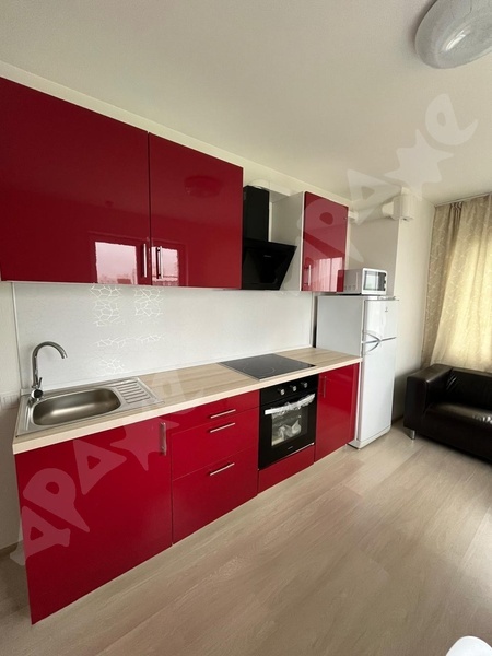 Квартира на 12-м этаже, из мебели есть диван-кровать, телевизор, ТВ тумба. Стиральная машинка. На кухне варочная поверхность, духовой шкаф, вытяжка, холодильник, микроволновка.
