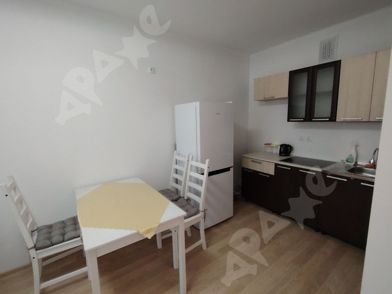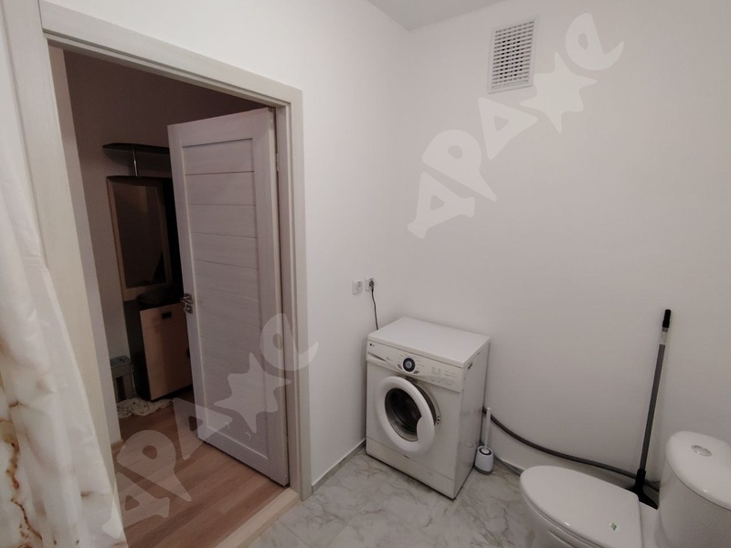 Квартира на 12-м этаже, из мебели есть диван-кровать, телевизор, ТВ тумба. Стиральная машинка. На кухне варочная поверхность, духовой шкаф, вытяжка, холодильник, микроволновка.