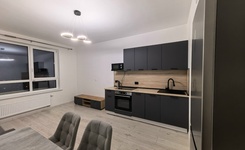 Евродвушка. Площадь 38,6 кв.м. Квартира на 21 этаже в новостройке 2025 года. Есть лоджия с панорамным остеклением. Окна квартиры - во двор. Сдаётся впервые (никто не жил, абсолютно новая мебель и техника). Есть кровать, новый матрас, диван, обеденный стол, стулья, кухонный гарнитур, холодильник, чайник, духовка, варочная панель, микроволновка, стиральная машина, тумба под ТВ. Санузел совмещённый. В шаговой доступности автобусная и трамвайная остановка, ТЦ Радуга Парк. Закрытый двор с красивой дворовой площадкой, чистый подъезд. Квартира сдаётся на длительный срок.