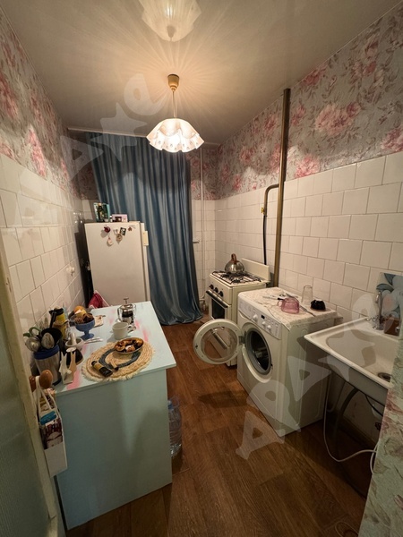 Из мебели и техники остаётся всё, что видите на фото: кухонный гарнитур, плита (газовая), холодильник, стиральная машина, телевизор, шкафы, мягкая мебель.