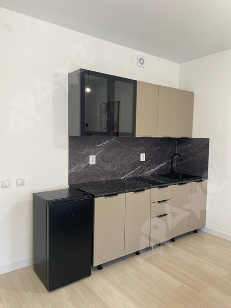 Студия полностью укомплектована : кухонный гарнитур с бытовой техникой, стиральная машина, душевая кабина, вместительные шкафы, рабочий стол, WiFi роутер.