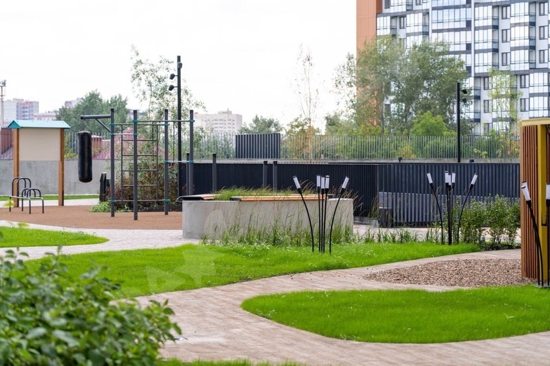 Двор: закрытая территория с живописным ландшафтом, зелеными насаждениями, детской площадкой и зонами отдыха с приятной вечерней подсветкой.
