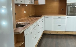 Кухня: встроенный гарнитур, духовой шкаф, вытяжка, новый холодильник, есть посуда и приборы, удобная зона столовой с диваном (доп спальное место).