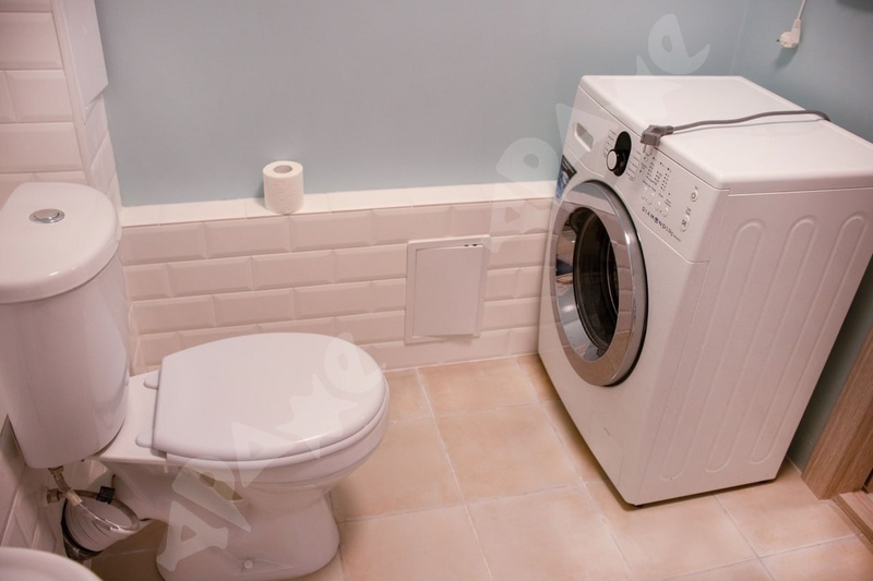 Из мебели и техники: двуспальный раскладной диван, кухонный гарнитур, вместительный шкаф. Есть посуда и приборы на две персоны, чайник, микроволновка, стол и два стула. Новый холодильник и стиральная машина.